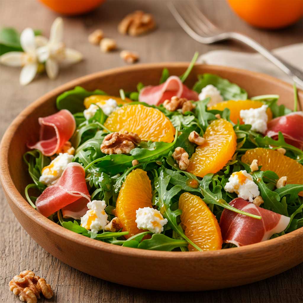 Imagínate una ensalada de rúcula con gajos de naranja, nueces y queso de cabra. El toque dulce equilibra el queso, la rúcula aporta frescura y el resultado es ligero, vistoso y perfecto para compartir. Si quieres darle un punto más especial, añade un poco de jamón serrano o unas láminas de aguacate.